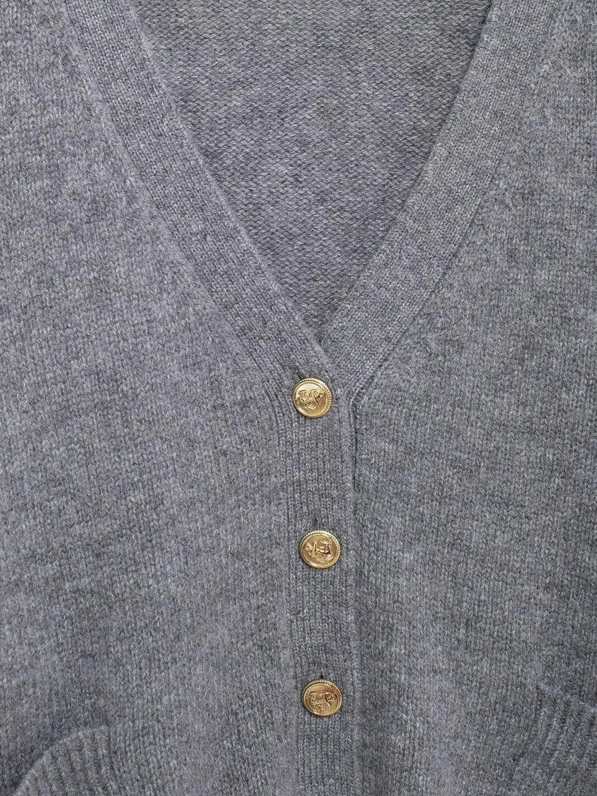 Elevate your everyday style with the Leona Cardigan, featuring a flattering V-neck and adorned with elegant gold-colored buttons. This timeless design combines sophistication and comfort, making it an essential piece for both casual and elegant outfits.